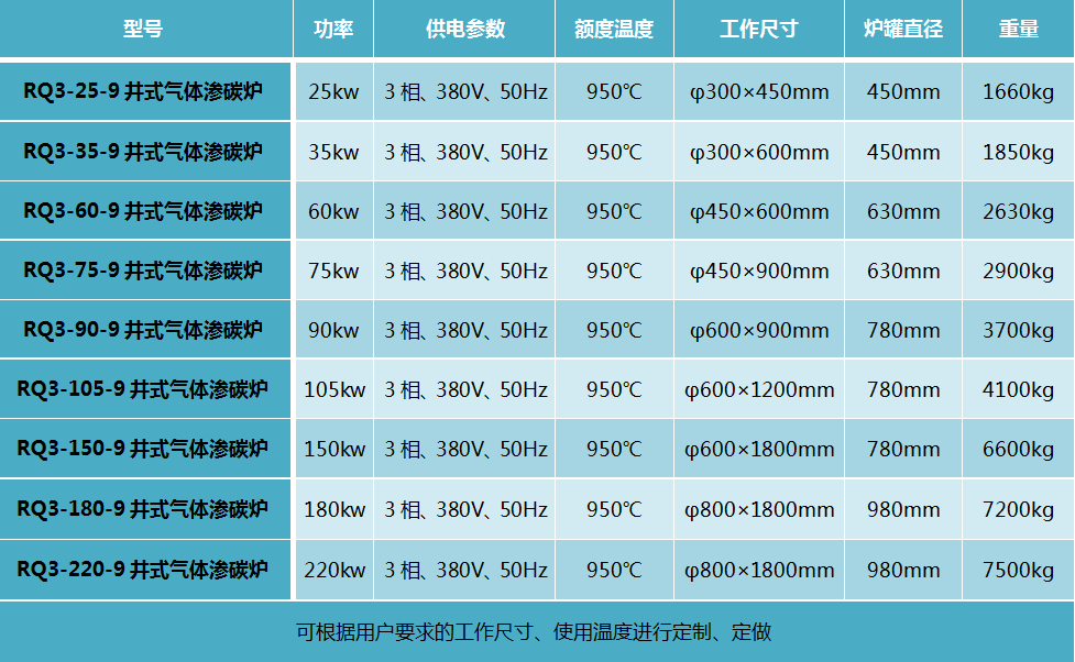井式氣體滲碳爐 此設備可根據用戶要求進行定制、定做,服務熱線:13666533225 RQ3系列井式氣體滲碳爐(以下簡稱電爐)系周期作業(yè)式電爐,主要供碳鋼機件的氣體滲碳等用。與電爐控制柜配合使用可自動控制及自動記錄電爐的溫度。 一、開爐前準備工作 1、清除爐罐內的碳黑,檢查密封襯墊。 2、檢查循環(huán)風扇、電動機,給軸承加潤滑脂、冷卻水套通水。 3、檢查熱電偶位置及油壓提升機構。 4、檢查滴定器、甲醇、煤油儲存器。 二、開爐操作規(guī)程 1、合上電源開關。 2、調整儀表自動控制裝置正常后才允許通電升溫。 3、升溫時,開動風扇。 4、爐溫升到850℃時,開始滴入煤油(或甲醇)。 5、爐溫到需要溫度后,切斷爐子和風扇的電源,才能裝進工件。然后關緊爐門,接通風扇和爐子電源,按范圍操作。 6、工件出爐后,關緊爐蓋,繼續(xù)未動風扇,切斷爐子電阻絲電源,滴入少量煤油。 7、爐溫降至850℃時,停止滴入煤油。 8、爐溫降至600℃時,停止風扇,切斷電源開關。